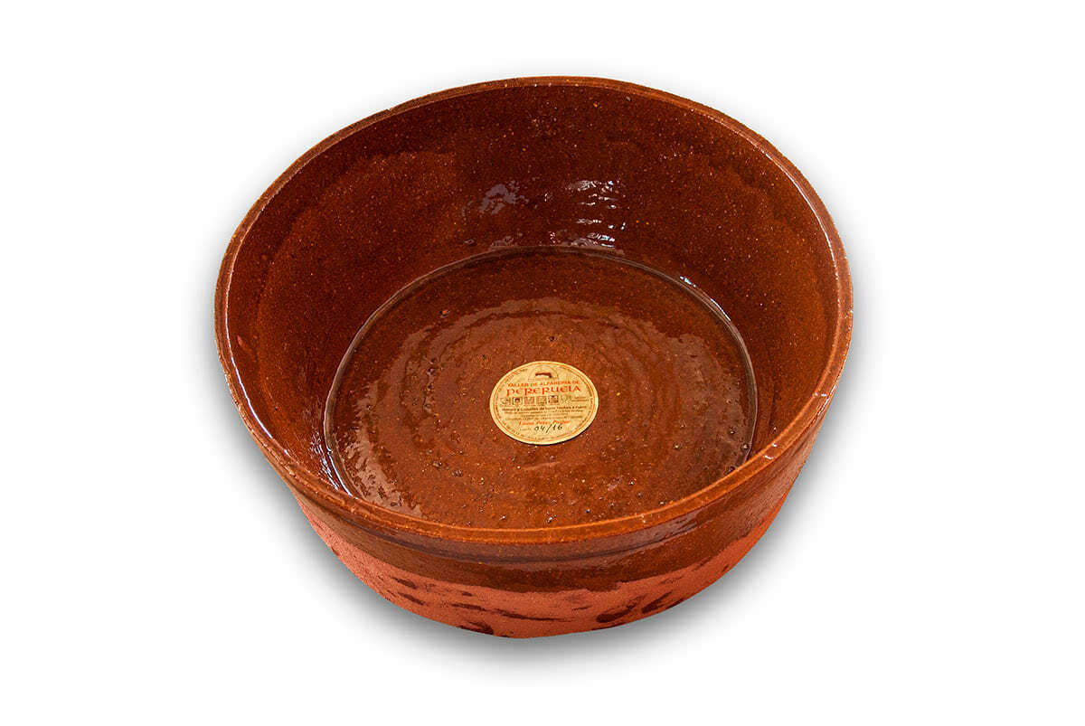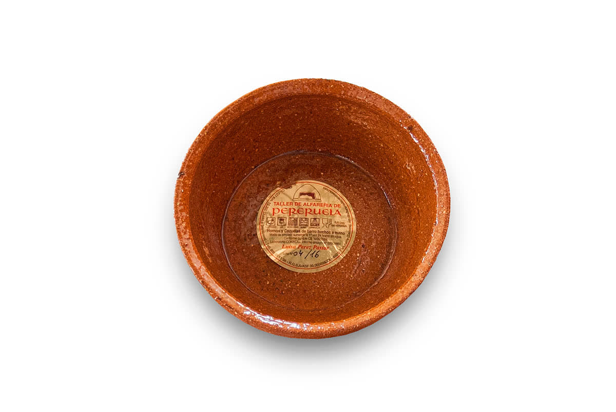 Cazuela de Pereruela con forma redonda y honda especial para guisar. Elaborada artesanalmente. Apta para electricidad, gas, microondas, horno y lavavajillas. Para uso exclusivo alimenticio. Sumergirlos en agua la primera vez durante 24 horas.